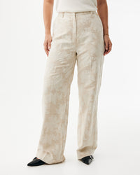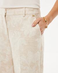 De natuurlijke materialen mix van katoen, linnen en viscose zorgt voor een ademende, comfortabele stof met een luxe uitstraling. Het jacquard weefsel geeft diepte en textuur aan het bloemenpatroon, waardoor deze broek een echte eyecatcher is.