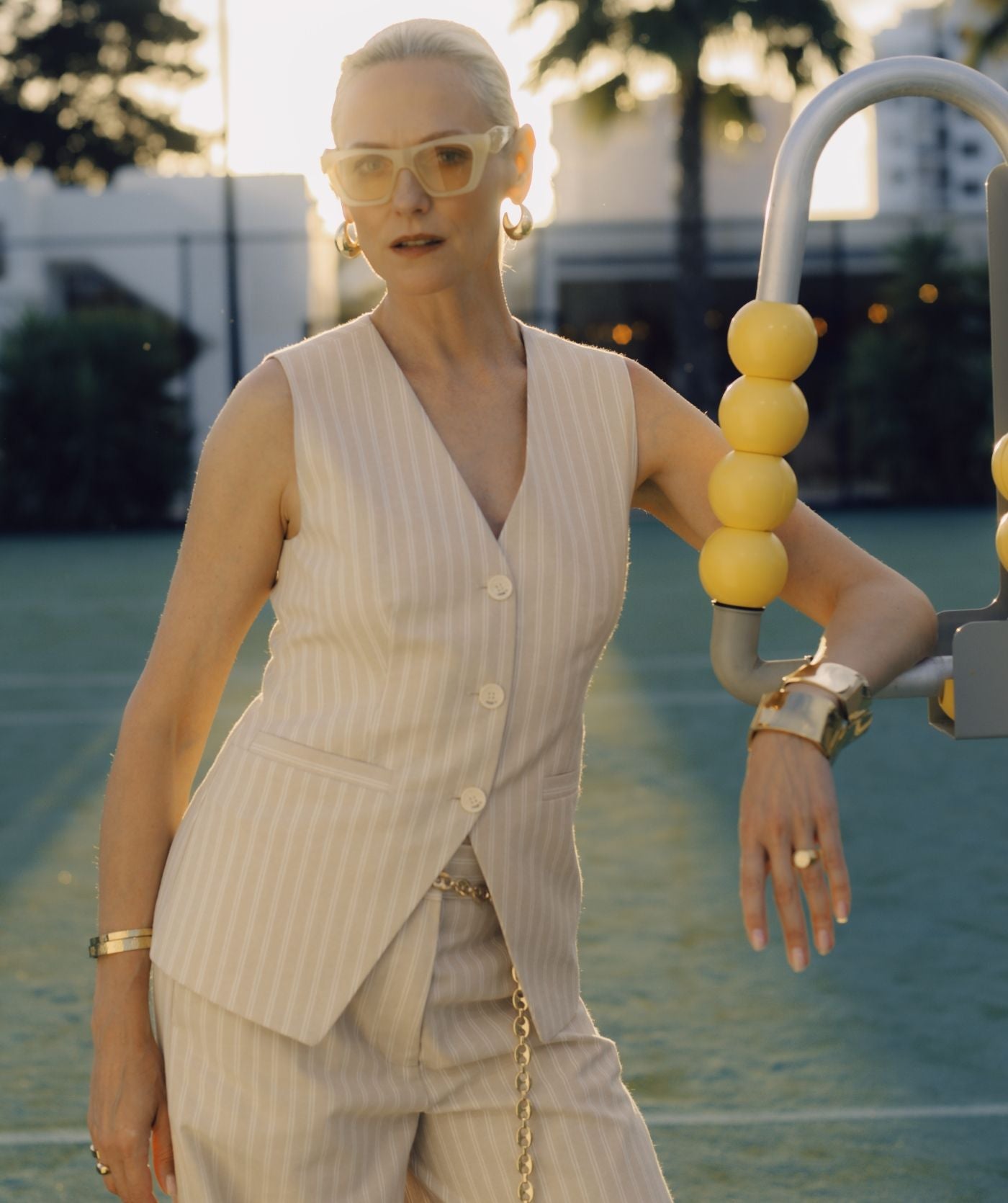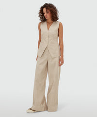 De JOSH V Inez dames top in de kleur Stone Stripe is een gilet met een lange, getailleerde pasvorm. Het item is gemaakt van polyester, viscose, linnen, katoen en lyocell en heeft een katoenen voering. Het yarn dyed verticale streeppatroon geeft een tijdloze uitstraling. Daarnaast is het gilet afgewerkt met een JOSH V branded knoopsluiting en een verstelbare gespsluiting aan de achterkant. Stylingtip: combineer de top met de bijpassende Odessa pantalon voor een elegante co-ord set, of draag met een basic top en jeans voor een moderne, casual look.