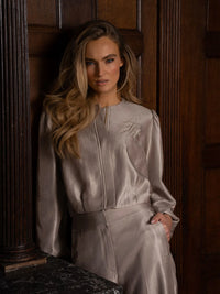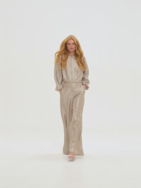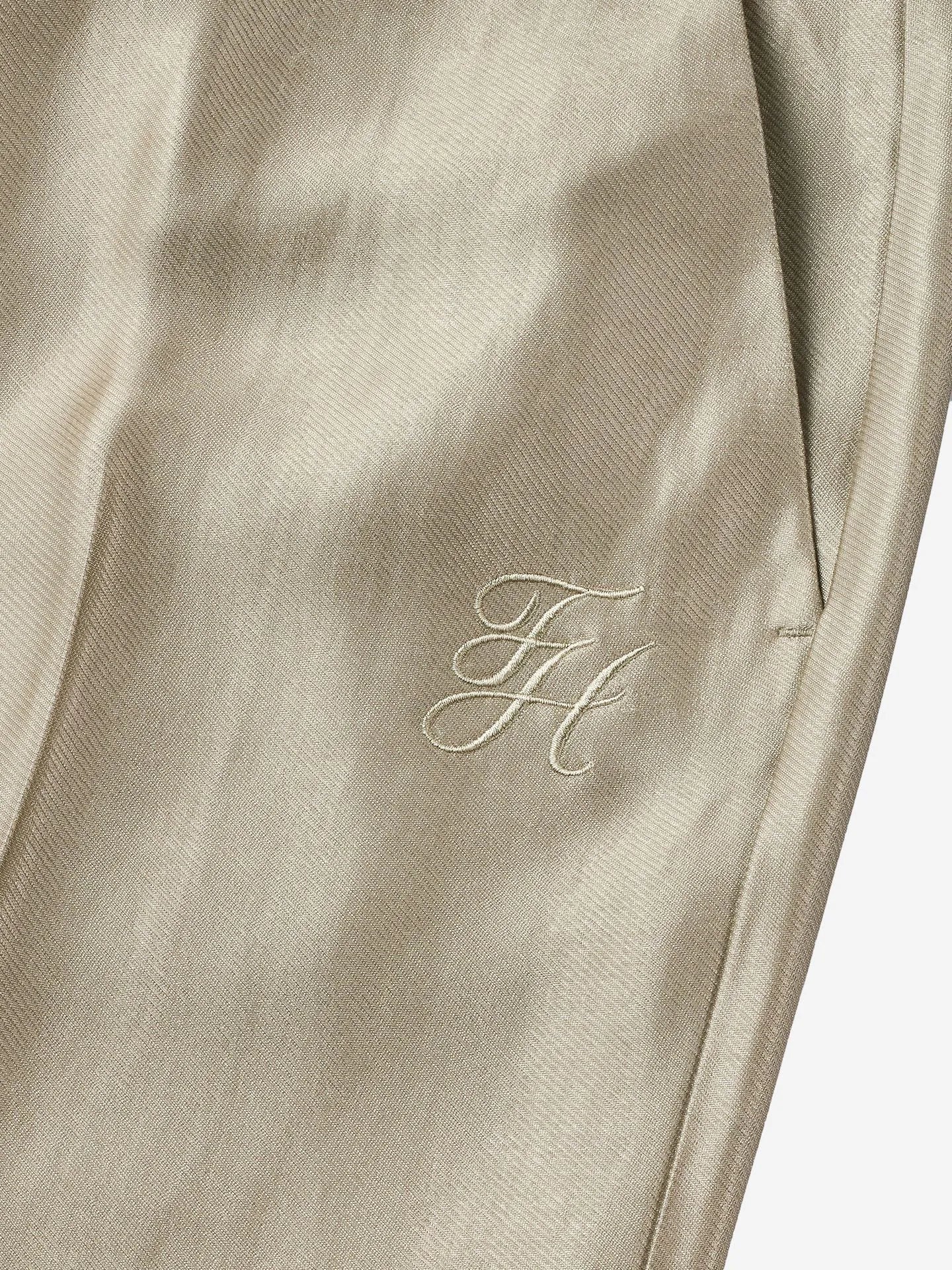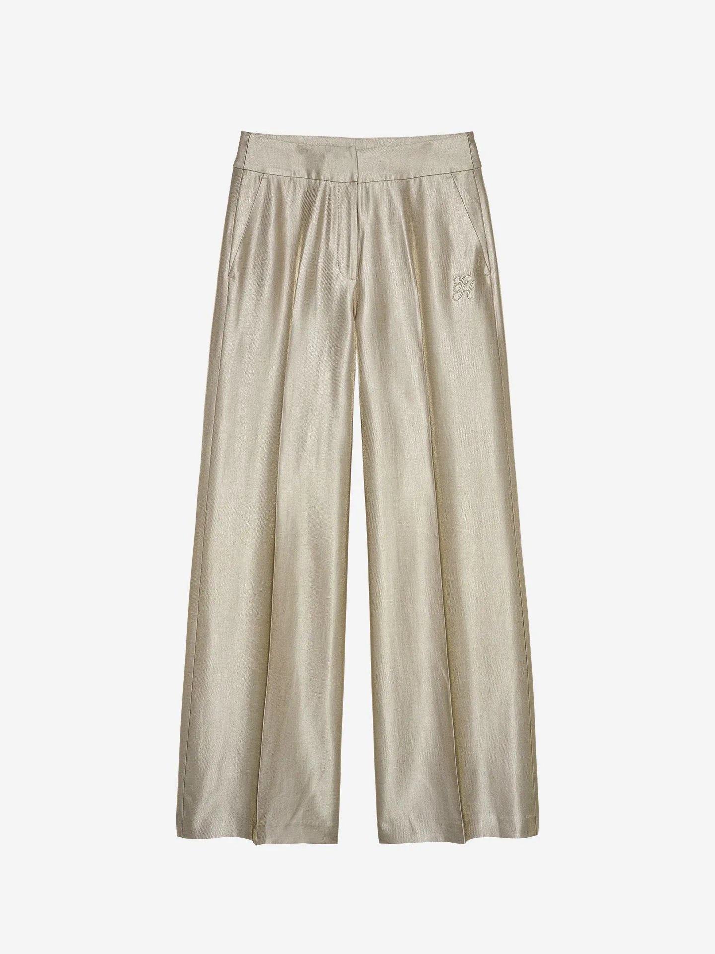 Broek met een glanzende stof, een geborduurd logo en een middelhoge taille. De broek heeft wijde pijpen en een ritssluiting.