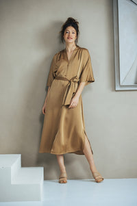 Ooh la la! Deze satijnen doorknoopjurk geeft je een instant feestelijke look én is verkrijgbaar in twee kleuren: goud en fuchsia. De midi-lengte is elegant, de aangeknipte mouwen flatteren en de smalle strikceintuur accentueert je taille perfect. Plooitjes bij de schouder en stofknoopjes zorgen voor een luxe afwerking, terwijl de zijsplitten voor een speelse twist zorgen. Of je nu naar een diner gaat of een feest: deze jurk steelt de show.